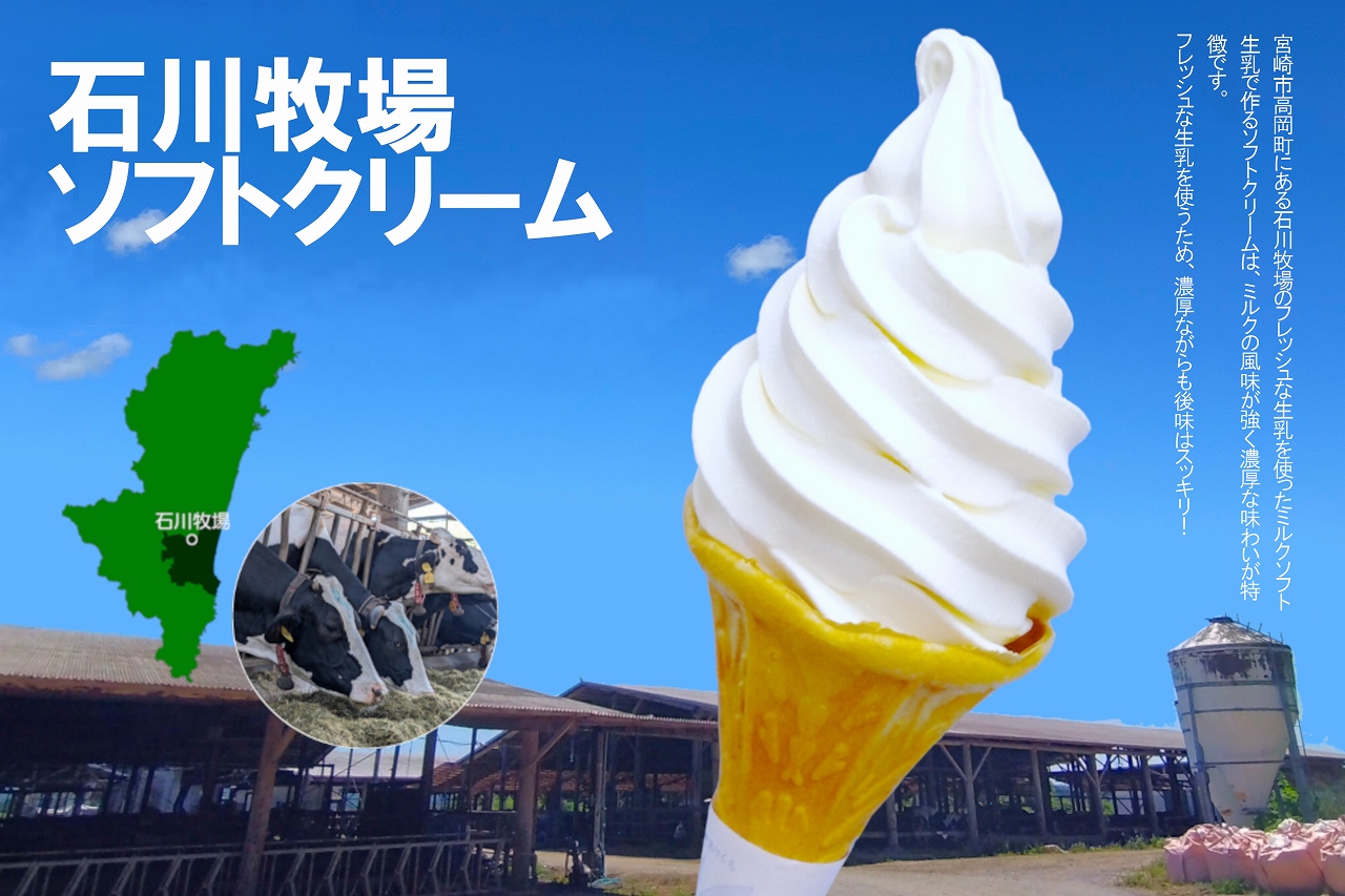 カフェコーナーでは、宮崎市高岡町にある石川牧場のフレッシュな生乳を使ったミルクソフトを販売しています。